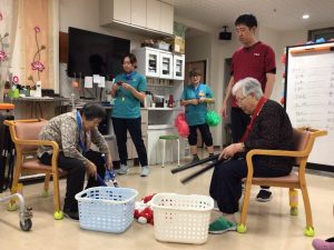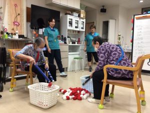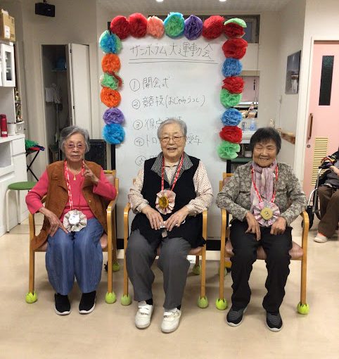 デイサービス「大池橋サンボラム」では、スポーツの秋にちなんでミニ運動会を開催しました。理事長からの開会あいさつのあと、利用者様の力強い選手宣誓。そしてチームにわかれてボール入れ競技を行いました。また同時に個人戦もおこない、3名の方が見事に金メダル、銀メダル、銅メダルを獲得されました。