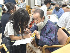 みなさん、元気に韓国語であいさつし、日本の歌謡曲や韓国の民謡などを歌ってくれました。特に、韓国民謡「密陽アリラン」に合わせた手遊びは大変好評でした。また、生徒さんたちが事前に質問を用意し、ハルモニたちからインタビューしました。お名前や生まれたところ、いつ日本に来たのか、好きな韓国料理などなど。